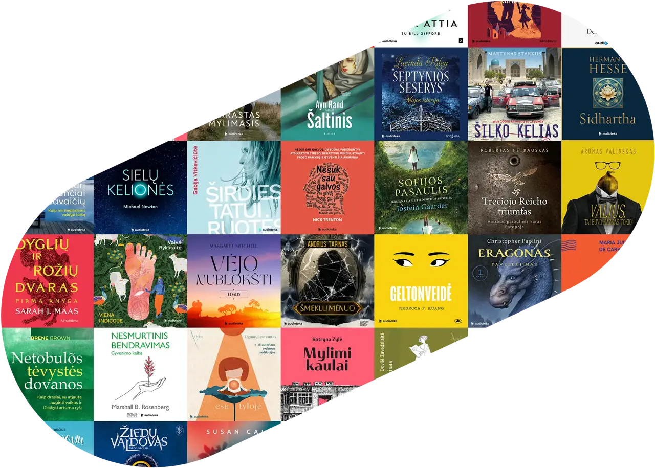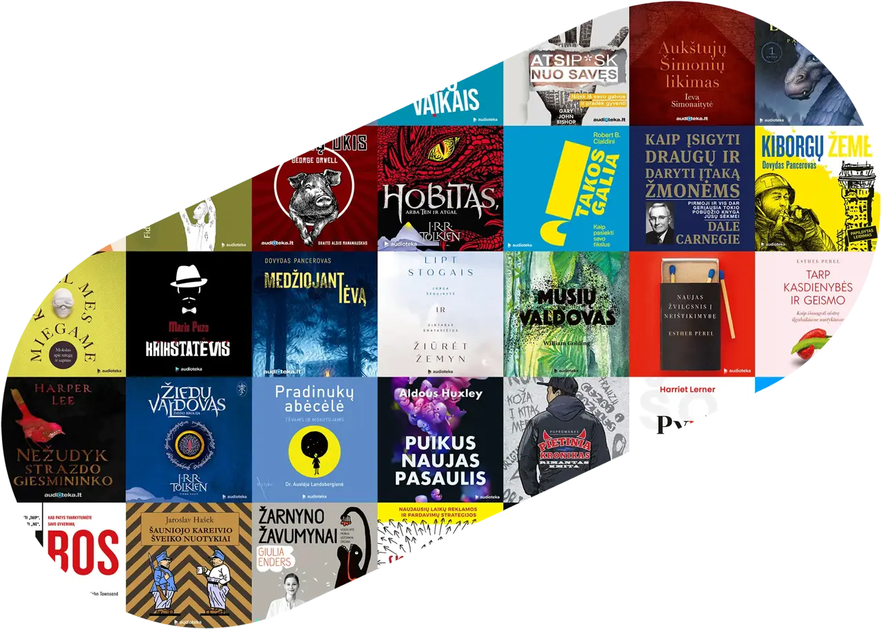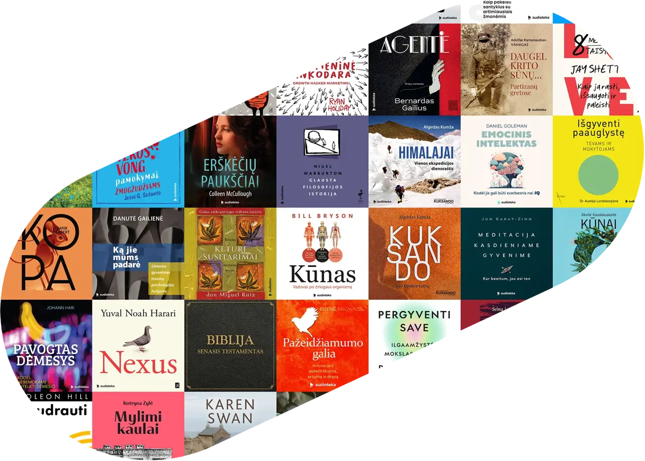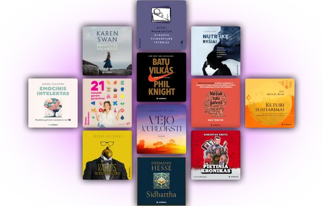 Klausykitės žymių saviugdos autorių – Dale Carnegie, Susan Cain, Tony Robbins ir daugelio kitų – audioknygų. Mėgaukitės įtraukiančia grožine literatūra – „Vėjo nublokšti”, „Šauniojo kareivio Šveiko nuotykiai”, „Altorių šešėly”, „Gyvulių ūkis” ir kt. Jūsų laukia ir audioserialai, meditacijų įrašai, trumpos istorijos bei Audioteka „šortai”.